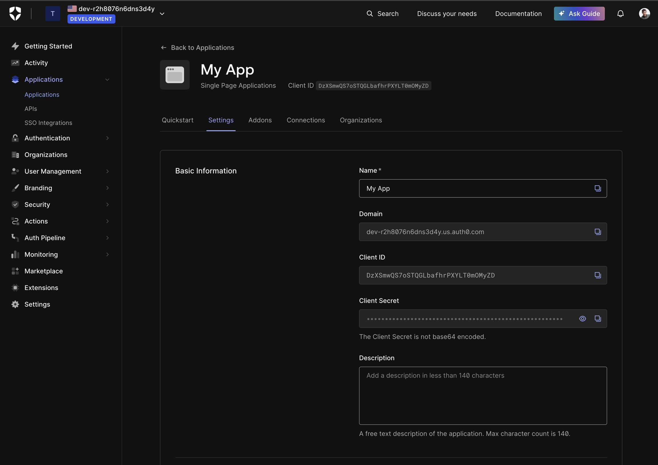 Navigate to the Settings tab to find the Domain and Client ID.