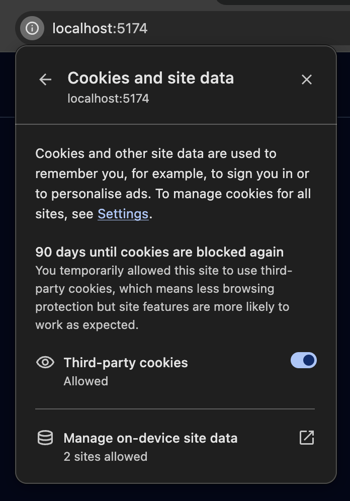 sessionRestorationMethod: "iframe"explicitely to force oidc-spa to use iframe.Allow third party cookies in localhost:
